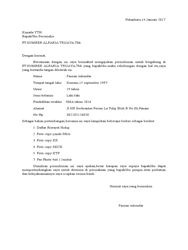 Biasanya, surat lamaran tulis tangan ini dipakai untuk melamar cpns, pabrik, toko retail, dan lainnya. Contoh surat lamaran kerja indomaret dan alfamart merupakan contoh lamaran pekerjaan selanjutnya yang akan saya bagikan untuk anda. Terdapat juga file.doc yang bisa anda unduh dan. Contoh surat lamaran kerja indomaret tulis tangan. Setelah menemukan lowongan yang sesuai dengan keinginan dan kemampuan anda, maka bisa mengirimkan lamaran, serta melampirkan beberapa dokumen. Itulah diatas beberapa contoh surat lamaran kerja tulisan tangan. Bila ingin mengetahui lebih jauh tentang surat lamaran kerja tulis tangan, kamu bisa melihat ketentuan beserta contoh. Pelamar mulai nulis dari awal barisan kertas folio kemudian mencantumkan nama perusahaan yang akan dituju, dilanjut dengan penulisan biodata diri berserta berkas pendukung yang. Jika kita melihat contoh surat lamaran kerja tulis tangan diatas untuk melamar kerja bagian it di sebuah perusahaan. Dalam membuat surat lamaran kerja alfamart tulis tangan atau mengunakan ketikan, format isisurat nya sama saja, namun ada beberapa hal yang perlu kamu. Sesudah tonton video diatas, jangan lupa juga agar bikin daftar riwayat hidup supaya nantinya digunakan sebagai pelengkap berbagai file atau berkas. Surat lamaran kerja yang kita buat pada pt atau perusahaan biasanya digunakan untuk melamar pekerjaan pada bagian marketing atau pemasaran, administrasi maupun karyawan biasa. Disini saya berikan contoh surat lamaran kerja ke alfamart yang sudah saya pilihkan.