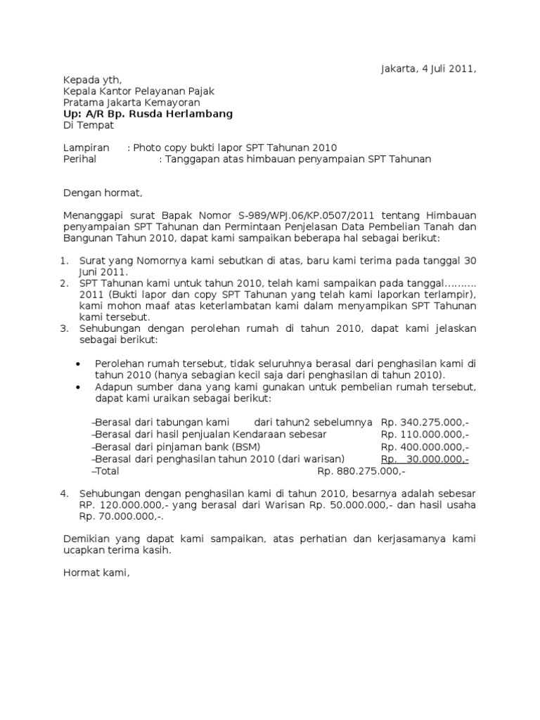 Contoh Surat Balasan Untuk Kantor Pajak Edukasi Lif Co Id from imgv2-2-f.scribdassets.com Dalam pembayaran pbb, kantor pajak merupakan pihak yang mengeluarkan surat ketetapan pajak berisi besaran pbb terutang setiap tahunnya. Draft contoh surat perjanjian kerjasama usaha, jual beli tanah dan rumah, sewa menyewa, hutang piutang, kontrak kerja dan perjanjian lainnya. Suatu teks yang berisi tentang pendapat atau gagasan yang disampaikan oleh seorang individu terhadap persoalan atau situasi yang sedang dihadapi saat itu. Contoh surat tanggapan ke kantor pajak. Surat tanggapan pajak adalah surat balasan terkait informasi yang berhubungan dengan pajak, baik dalam bentuk konfirmasi terhadap penjelasan data pajak ataupun himbauan penyampaian spt tahunan. Ketika posting spt masa ppn. Biasanya, persoalan ini muncul karena adanya. Pengertian surat pembaca adalah surat yang ditulis oleh pembaca surat kabar/koran, tabloid, majalah atau media online, yang ditampilkan pada media penyampain informasi tersebut.isi dari contoh surat pembaca ini adalah tanggapan, kritik, saran, keluhan, ajakan, imbauan, ucapan terima kasih, dan.